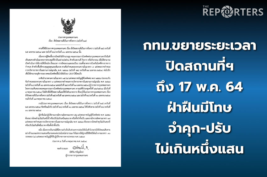 กทม.ประกาศสั่งปิดสถานที่เป็นการชั่วคราวต่อถึง 17 พ.ค. 64 ฝ่าฝืนมีโทษ จำคุก-ปรับไม่เกิน 1 แสน