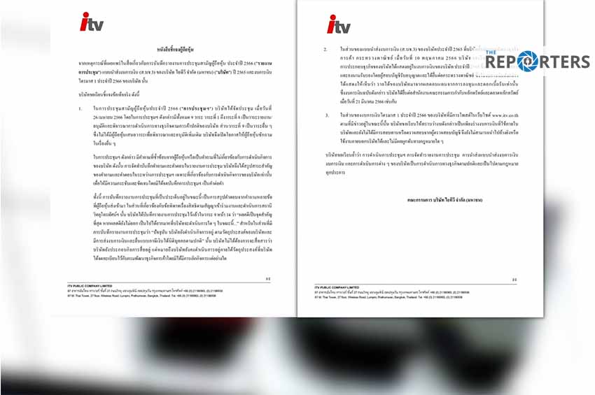 วันนี้ (15 มิ.ย. 66) บริษัท ไอทีวี จำกัด (มหาชน) ออกหนังสือชี้แจงผู้ถือหุ้น ใจความว่า จากเหตุการณ์ที่เผยแพร่ในสื่อเกี่ยวกับการบันทึกรายงานการประชุมสามัญผู้ถือหุ้น ประจำปี 2566 (“รายงานการประชุม”) แบบนำส่งงบการเงิน (ส.บช.3) ของบริษัท ไอทีวี จำกัด (มหาชน) (“บริษัท”) ปี 2565 และงบการเงินไตรมาส 1 ประจำปี 2566 ของบริษัท นั้นบริษัทขอเรียนชี้แจงข้อเท็จจริง ดังนี้