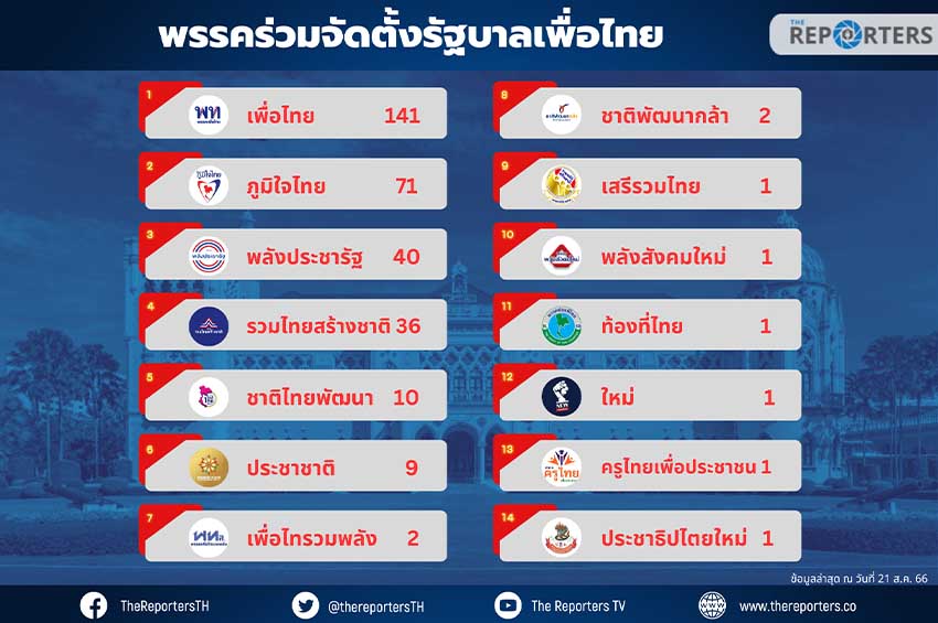 วันนี้ (21 ส.ค. 66) มีรายงานความคืบหน้าในการจัดตั้งรัฐบาลของพรรคเพื่อไทย โดยในเวลา 12.00 น.จะมีการประชุมแกนนำพรรคร่วมรัฐบาล และจะแถลงข่าวร่วมกันเวลา 14.00 น.ที่อาคารรัฐสภา โดยล่าสุดมีพรรคการเมืองร่วมแล้ว 14 พรรค รวม 317 เสียง ประกอบด้วย