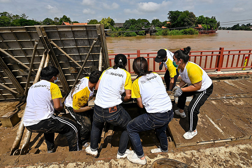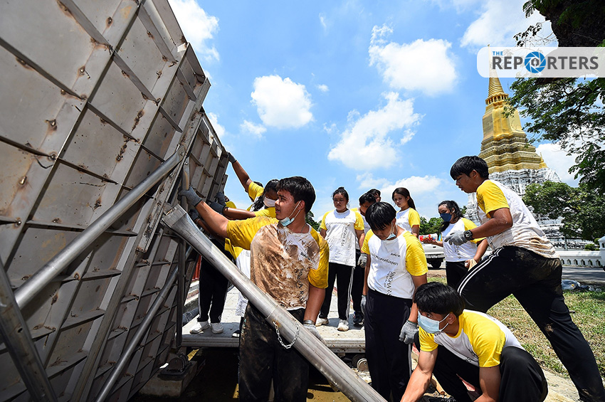 เครือข่ายนักศึกษาสิงห์อาสา 3 สถาบัน ร่วมกับ ปภ.อยุธยา สร้างพนังกั้นน้ำ รับมือน้ำท่วมโบราณสถาน ที่อยุธยา