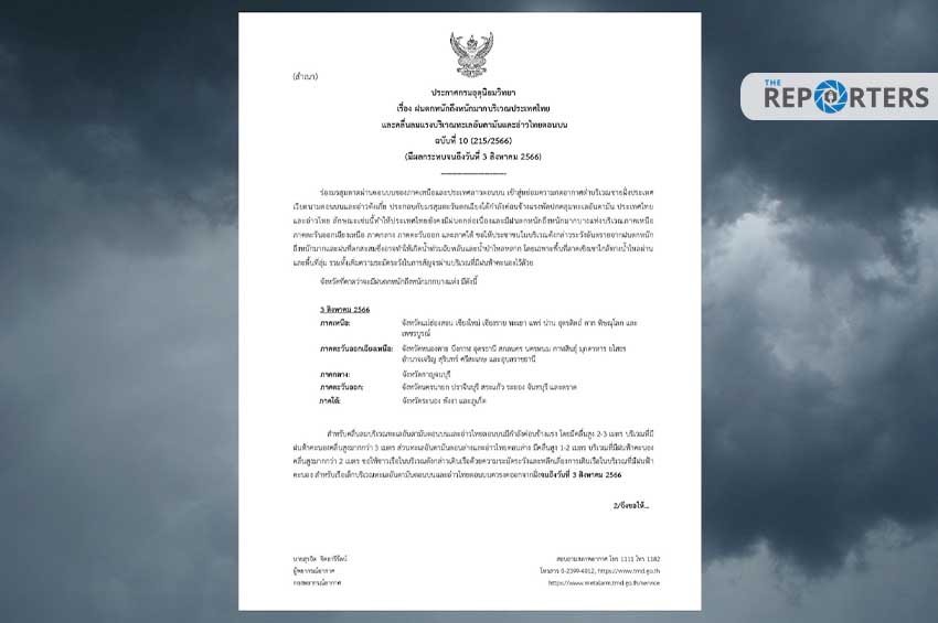 กรมอุตุนิยมวิทยา ออกประกาศ ฉบับที่ 10 (215/2566) เรื่องฝนตกหนักถึงหนักมากบริเวณประเทศไทย และคลื่นลมแรงบริเวณทะเลอันดามันและอ่าวไทยตอนบน มีผลกระทบจนถึงวันที่ 3 สิงหาคม 2566 พบว่าร่องมรสุมพาดผ่านตอนบนของภาคเหนือและประเทศลาวตอนบน เข้าสู่หย่อมความกดอากาศต่ำบริเวณชายฝั่งประเทศเวียดนามตอนบนและอ่าวตังเกี๋ย ประกอบกับมรสุมตะวันตกเฉียงใต้กำลังค่อนข้างแรงพัดปกคลุมทะเลอันดามัน ประเทศไทยและอ่าวไทย ทำให้ประเทศไทยยังคงมีฝนตกต่อเนื่องและมีฝนตกหนักถึงหนักมากบางแห่งบริเวณภาคเหนือภาคตะวันออกเฉียงเหนือ ภาคกลาง ภาคตะวันออก และภาคใต้