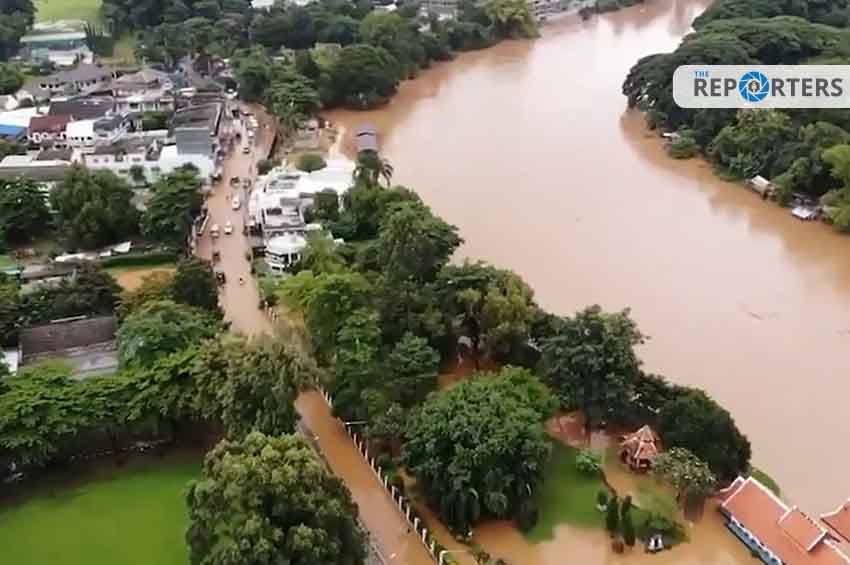 กลุ่มงานจราจรตำรวจภูธรจังหวัดเชียงใหม่ นำโดรนขึ้นบันทึกภาพมุมสูง พบว่า ปริมาณน้ำปิงมีสีขุ่นแดง เริ่มหลากท่วมบ้านเรือนประชาชนสองฝั่งเป็นวงกว้าง ส่วนทางด้านทิศเหนือของเมือง อ.แม่ริม มีฝนตกหนักตลอดทั้งคืน น้ำไหลหลากรุนแรงลงสู่น้ำสาขาส่งผลกระทบต่อประชาชนที่อยู่สองฝั่ง ล่าสุด สะพานข้ามในปางช้างแม่สาพังเสียหายทั้งสองสะพาน ไม่สามารถข้ามไปยังจุดดูแลช้างกว่า 70 เชือกได้ และยังพบนักท่องเที่ยวติดอยู่ตามรีสอร์ทริมน้ำ ส่วนด้านทิศใต้ ทางหลวงเชียงใหม่-หางดง ต่อเนื่องสันป่าตอง มีน้ำทะลักท่วมถนนใหญ่ทั้งสองฝั่ง รถเล็กไม่สามารถสัญจรไปมาได้ น้ำยังท่วมขังในหลายพื้นที่