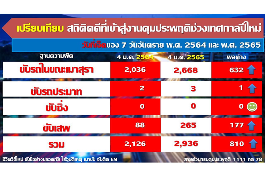 วันนี้ (5 มกราคม 2565) นายวิตถวัลย์ สุนทรขจิต อธิบดีกรมคุมประพฤติ เปิดเผยว่า สถิติคดีที่ศาลสั่งคุมความประพฤติวันที่เจ็ดของ 7 วันอันตราย (4 มกราคม 2565) มีจำนวนทั้งสิ้น 2,936 คดี จำแนกเป็น คดีขับรถในขณะเมาสุรา 2,668 คดี คิดเป็นร้อยละ 90.87 ติด EM 7 ราย คดีขับรถประมาท 3 คดี คิดเป็นร้อยละ 0.1 และคดีขับเสพ 265 คดี คิดเป็นร้อยละ 9.03