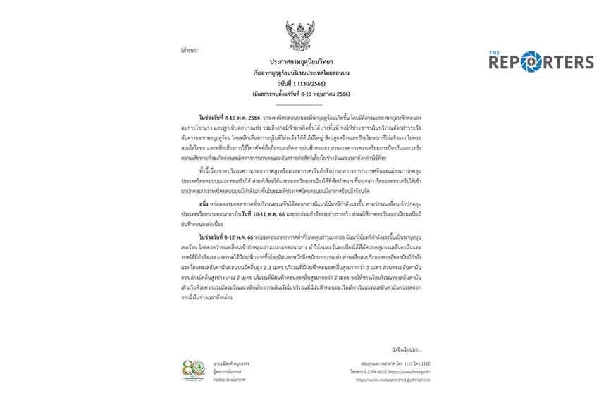 วันนี้ (6 พ.ค. 66) กรมอุตุนิยมวิทยา ออกประกาศ ฉบับที่ 1 (130/2566) แจ้งเตือนในช่วงวันที่ 8-10 พ.ค. 66 ประเทศไทยตอนบนจะมีพายุฤดูร้อนเกิดขึ้น มีลักษณะของพายุฝนฟ้าคะนอง ลมกระโชกแรง ลูกเห็บตกบางแห่ง รวมถึงอาจมีฟ้าผ่าเกิดขึ้นบางพื้นที่ ให้ประชาชนในบริเวณดังกล่าวระวังอันตรายจากพายุฤดูร้อน โดยหลีกเลี่ยงการอยู่ในที่โล่งแจ้ง ใต้ต้นไม้ใหญ่ สิ่งปลูกสร้างและป้ายโฆษณาที่ไม่แข็งแรง ไม่ควรสวมใส่โลหะ และหลีกเลี่ยงการใช้โทรศัพท์มือถือขณะเกิดพายุฝนฟ้าคะนอง ส่วนเกษตรกรควรเตรียมการป้องกันและระวังความเสียหายที่จะเกิดต่อผลผลิตทางการเกษตรและอันตรายต่อสัตว์เลี้ยงในช่วงวันดังกล่าว