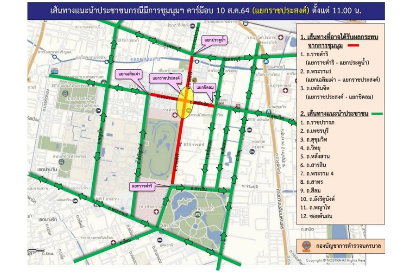 พล.ต.ต.จิรสันต์ แก้วแสงเอก รอง ผบช.น. และ พล.ต.ต.ธีระพงษ์ วงษ์รัฐพิทักษ์ ผบก.จร. ประชาสัมพันธ์เส้นทางหลีกเลี่ยง กรณีวันที่ 10 ส.ค.2564 มีการนัดรวมกลุ่มชุมนุมฯ คาร์ม็อบ บริเวณแยกราชประสงค์เวลา 13.00 น. โดยขอให้หลีกเลี่ยงเส้นทางตั้งแต่เวลา 11.00 น. เป็นต้นไป จนเสร็จสิ้นการชุมนุมฯ ดังนี้