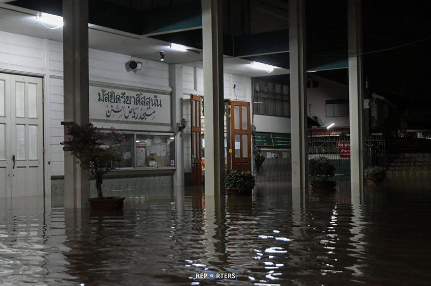 ส่วนชุมชนหมู่ 9 พิบูลสงคราม 1 ที่ตั้งของมัสยิดรี่ยาดิ๊สสุนัน ที่ชาวมุสลิมในพื้นที่มักมาประกอบศาสนกิจ กลายเป็นพื้นที่ที่มีน้ำท่วมขังสูงที่สุด ชาวบ้านต้องใช้เรือในการรับส่งคนในชุมชน จากการลงพื้นที่พบว่า สิ่งที่ชาวบ้านต้องการยังมีอีกหลายอย่าง ทั้งสะพานไม้ และเรือสำหรับเข้าออกชุมชน รถห้องน้ำ รวมทั้งการปักธงแดง เตือนเรือให้สัญจรด้วยความระมัดระวัง