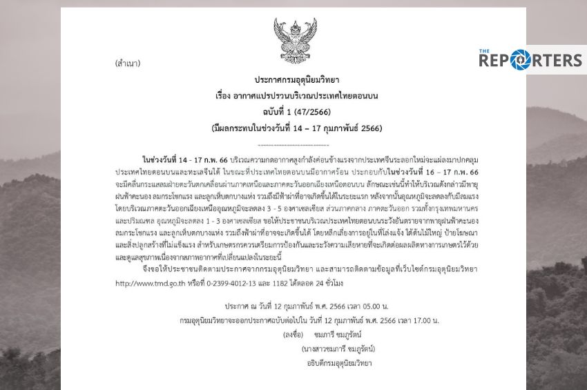 วันนี้ (11 ก.พ. 66) กรมอตุนิยมวิทยา ออกประกาศ เรื่อง อากาศแปรปรวนบริเวณประเทศไทยตอนบน ฉบับที่ 1 (47/2566) ระบุว่า ในช่วงวันที่ 14 – 17 ก.พ. 66 บริเวณความกดอากาศสูงกำลังค่อนข้างแรงจากประเทศจีนระลอกใหม่จะแผ่ลงมาปกคลุมประเทศไทยตอนบนและทะเลจีนใต้ ในขณะที่ประเทศไทยตอนบนมีอากาศร้อน ประกอบกับในช่วงวันที่ 16 – 17 ก.พ. 66 จะมีคลื่นกระแสลมฝ่ายตะวันตกเคลื่อนผ่านภาคเหนือและภาคตะวันออกเฉียงเหนือตอนบน