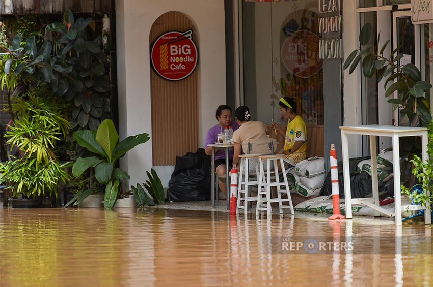 ผู้สื่อข่าวรายงานต่อว่า ประชาชนในพื้นที่ที่ได้รับผลกระทบจากเหตุการณ์น้ำท่วมสูง ได้เข้าจองที่พักโรงแรมในพื้นที่โดยรอบที่น้ำยังไม่ท่วมจำนวนมาก จนทำให้โรงแรมหลายแห่งในอำเภอเมืองเต็ม