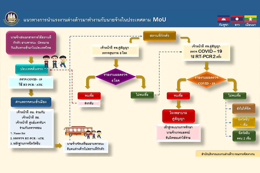 5. เมื่อคนต่างด้าวเดินทางเข้ามาในราชอาณาจักรต้องแสดงหนังสือยืนยันการอนุญาตให้เข้ามาทำงาน ผลตรวจโควิด-19 และหลักฐานการได้รับวัคซีน(ถ้ามี) สำนักงานตรวจคนเข้าเมืองจะตรวจลงตราอนุญาตวีซ่า (Non – Immigrant L-A) เป็นระยะเวลา 2 ปี จากนั้นจึงเดินทางไปยังสถานที่กักตัว โดยยานพาหนะที่นายจ้างแจ้งไว้เท่านั้น และต้องเดินทางตามเส้นทางที่กำหนด ห้ามแวะสถานที่ใดๆ ก่อนถึงสถานที่กักตัว