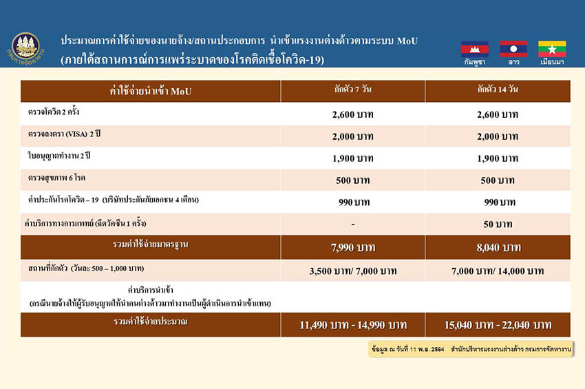 โดยการนำแรงงานต่างด้าวมาทำงานในไทย มีค่าใช้จ่ายรวม 11,490–22,040 บาทต่อแรงงานต่างด้าว 1 คน ประกอบด้วยค่าตรวจโควิด 2 ครั้ง 2,600 บาท ตรวจลงตราวีซ่า (2 ปี) 2,000 บาท ใบอนุญาตทำงาน (2 ปี) 1,900 บาท ตรวจสุขภาพ 6 โรค 500 บาท ค่าประกันสุภาพรวมโรคโควิด-19 (บริษัทประกันภัยเอกชน 4 เดือน) 990 บาท ค่าบริการทางการแพทย์ (ฉีดวัคซีน) 50 บาท และค่าสถานที่กักตัว (วันละ 500–1,000 บาท) กักตัว 7 วัน 3,500/7,000 บาท และกักตัว 14 วัน 7,000–14,000 บาท