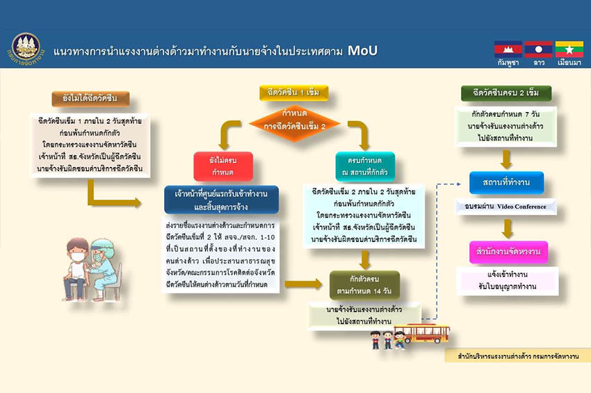 กรณีคนต่างด้าวติดเชื้อฯ นายจ้างหรือบริษัทประกันภัยเป็นผู้รับผิดชอบค่ารักษา ซึ่งวันสุดท้ายของการกักตัวแรงงานต่างด้าวที่ยังรับวัคซีนไม่ครบเกณฑ์ จะได้รับการฉีดวัคซีนโดยกระทรวงแรงงานเป็นผู้จัดหาให้ ในส่วนของเข็มที่ 2 กระทรวงแรงงานจะประสานสาธารณสุขจังหวัดปลายทางเพื่อนัดหมายฉีดวัคซีนให้แก่แรงงานต่างด้าวตามกำหนด