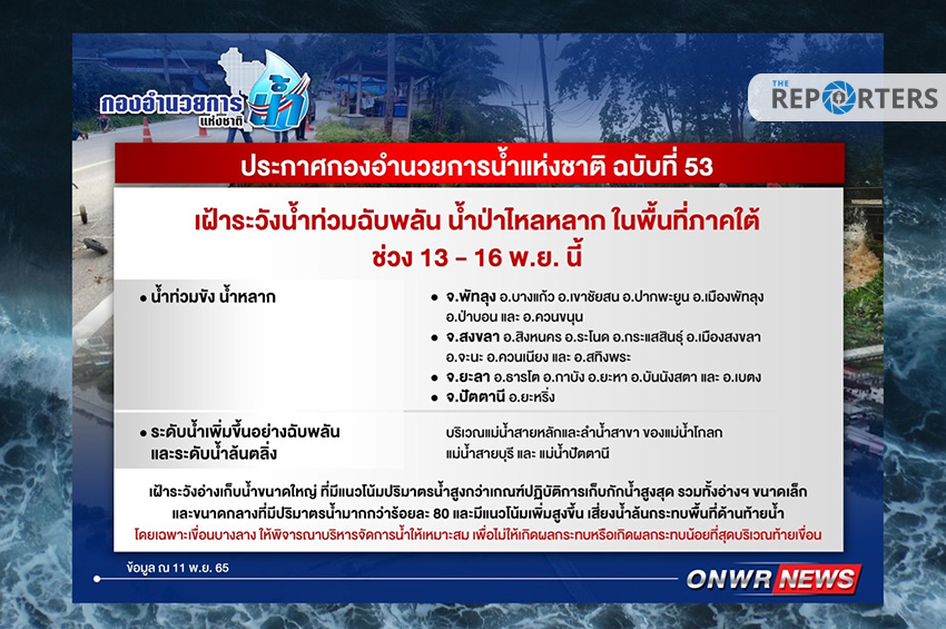 กองอำนวยการน้ำแห่งชาติ (กอนช.) ออกประกาศฉบับที่ 53/2565 เรื่อง “เฝ้าระวังน้ำท่วมฉับพลัน น้ำป่าไหลหลาก ในพื้นที่ภาคใต้” โดยระบุว่า จากที่ได้ติดตามสถานการณ์ในพื้นที่ภาคใต้ พบว่า มีฝนตกหนักถึงหนักมากบริเวณภาคใต้ตอนล่างในช่วงที่ผ่านมา และมีปริมาณฝนสะสมมากกว่า 200 มิลลิเมตร
