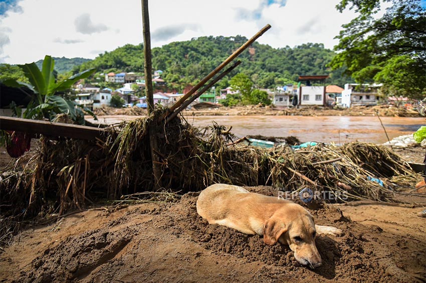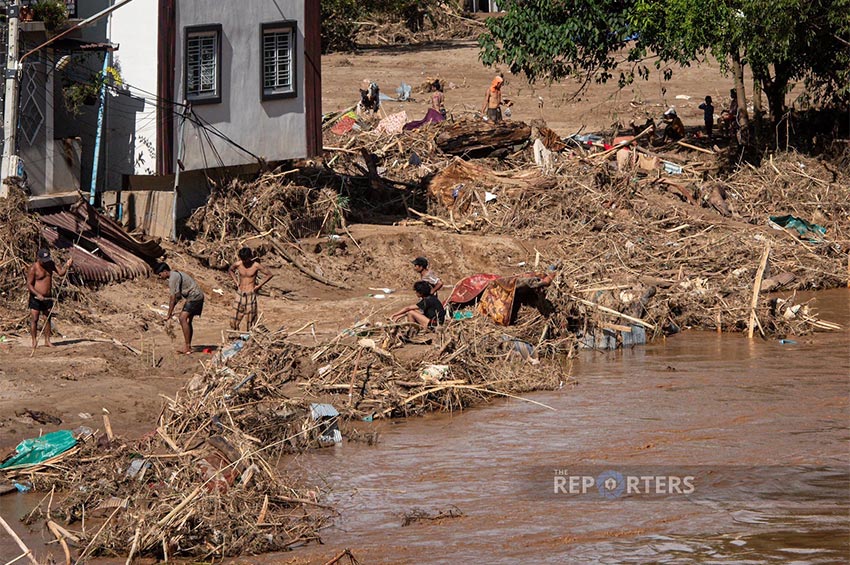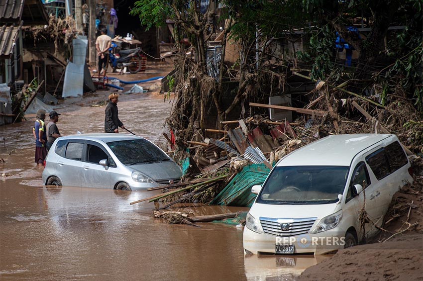 ส่วนในบางจุดที่น้ำยังท่วมอยู่ รถ และสิ่งของยังจมอยู่กับน้ำ ทำให้ชาวบ้านในเมียนมา เร่งนำเครื่องสูบน้ำ มาสูบน้ำออกจากภายในตัวบ้าน รวมถึงบางจุดที่เป็นภูเขา ยังมีเศษดินสไลด์อย่างเห็นได้ชัด