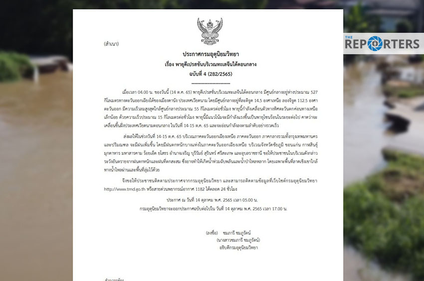 กรมอุตุนิยมวิทยา ออกประกาศ เรื่อง “พายุดีเปรสชันบริเวณทะเลจีนใต้ตอนกลาง” ฉบับที่ 4 ลงวันที่ 14 ตุลาคม 2565 ระบุว่า เมื่อเวลา 04.00 น. ของวันนี้ (14 ต.ค. 65) พายุดีเปรสชั่นบริเวณทะเลจีนใต้ตอนกลาง มีศูนย์กลางอยู่ห่างประมาณ 527 กิโลเมตร ทางตะวันออกเฉียงใต้ของเมืองดานัง ประเทศเวียดนาม โดยมีศูนย์กลางอยู่ที่ละติจูด 14.5 องศาเหนือ ลองจิจูด 112.5 องศาตะวันออก มีความเร็วลมสูงสุดใกล้ศูนย์กลางประมาณ 55 กิโลเมตรต่อชั่วโมง