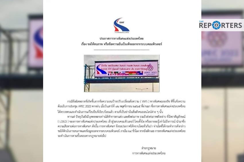 กรณีข้อผิดพลาดที่เกิดขึ้นจากข้อความบนป้ายปรับเปลี่ยนข้อความ ( VMS ) ทางพิเศษฉลองรัช ที่ขึ้นข้อความต้อนรับการประชุม APEC 2022 ตกหล่น เมื่อวันเสาร์ที่ 12 พฤศจิกายน 2565 ที่ผ่านมา ซึ่งการทางพิเศษแห่งประเทศไทย ได้ตรวจพบและดำเนินการแก้ไขเป็นที่เรียบร้อยแล้ว ตามที่เป็นข่าวในสื่อสังคมออนไลน์ต่าง ๆ นั้น