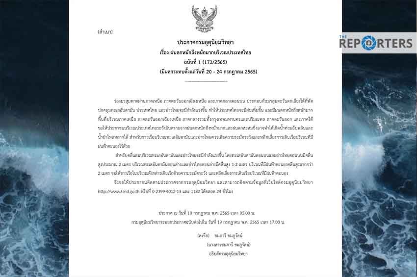 กรมอุตุนิยมวิทยา ออกประกาศเรื่อง “ฝนตกหนักถึงหนักมากบริเวณประเทศไทย (มีผลกระทบตั้งแต่วันที่ 20-24 กรกฎาคม 2565)” ฉบับที่ 1 ลงวันที่ 19 กรกฎาคม 2565 ระบุว่า ร่องมรสุมพาดผ่านภาคเหนือ ภาคตะวันออกเฉียงเหนือ และภาคกลางตอนบน ประกอบกับมรสุมตะวันตกเฉียงใต้ที่พัดปกคลุมทะเลอันดามัน ประเทศไทย และอ่าวไทยจะมีกำลังแรงขึ้น ทำให้ประเทศไทยจะมีฝนเพิ่มขึ้น และมีฝนตกหนักถึงหนักมากพื้นที่บริเวณภาคเหนือ ภาคตะวันออกเฉียงเหนือ ภาคกลางรวมทั้งกรุงเทพมหานครและปริมณฑล ภาคตะวันออก และภาคใต้