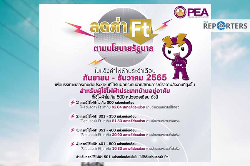 การไฟฟ้าส่วนภูมิภาค (PEA) แจ้งมาตรการช่วยเหลือค่าไฟฟ้าเพื่อบรรเทาผลกระทบต่อประชาชนที่ได้รับผลกระทบจากสถานการณ์ราคาพลังงานที่สูงขึ้น สำหรับผู้ใช้ไฟฟ้าประเภทที่ 1 บ้านอยู่อาศัย ที่ใช้ไฟฟ้าไม่เกิน 500 หน่วยต่อเดือน ตั้งแต่ใบแจ้งค่าไฟฟ้าประจำเดือนกันยายน – ธันวาคม 2565 ดังนี้