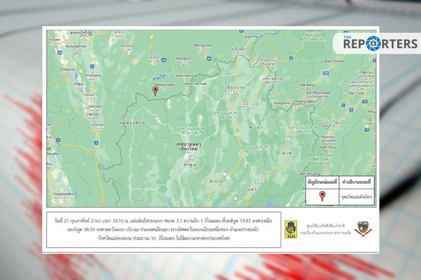 AROUND THAILAND เกิดแผ่นดินไหวขนาด 3.1 ที่เมียนมา ห่างแม่ฮ่องสอน 35 กม. ไม่มีผลกระทบต่อไทย วันนี้ (21 ก.พ. 66) ปภ.รายงานเมื่อเวลา 18.10 น. เกิดแผ่นดินไหวบนบก ขนาด 3.1 ความลึก 1 กม. บริเวณประเทศเมียนมา ทางทิศตะวันออกเฉียงเหนือของ อ.ปางมะผ้า จ.แม่ฮ่องสอน ประมาณ 35 กม. ไม่มีผลกระทบต่อประเทศไทย Tags: ปางมะผ้า เมียนมา แผ่นดินไหว แม่ฮ่องสอน แนะแนวเรื่อง Previous Previous post: ครม. อนุมัติ 1,501 ล้าน ให้กองทุนฟื้นฟูและพัฒนาเกษตรกร แก้ไขปัญหาหนี้Next Next post: TikTok พร้อมรับเลือกตั้ง 66 สร้างเครื่องมือตรวจสอบความถูกต้องของเนื้อหา Related Posts ราชกิจจาฯ เผยแพร่ “มาตรการสงกรานต์ 65” มีผล 1 เมษายนนี้ ศกพ. เผย PM2.5 เกินค่ามาตรฐานใน 55 จังหวัด คาด 8-14 มี.ค. มีแนวโน้มฝุ่นเพิ่มขึ้นบางพื้นที่ เหนือ-อีสานมีหมอกในตอนเช้า ฝนตกหนักบางแห่งภาคใต้ตอนล่าง