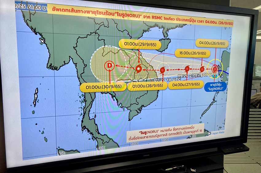 ดร.ชมภารี ชมภูรัตน์ อธิบดีกรมอุตุนิยมวิทยา รายงานสสถานการณ์ว่า เมื่อเวลา 07.00 น. ของวันนี้ พายุไต้ฝุ่นโนรู บริเวณทะเลจีนใต้ตอนกลาง มีศูนย์กลางอยู่ที่ละติจูด 16.2 องศาเหนือ ลองจิจูด 118.4 องศาตะวันออก มีความเร็วลมสูงสุดใกล้ศูนย์กลางประมาณ 130 กิโลเมตรต่อชั่วโมง พายุนี้กำลังเคลื่อนตัวทางทิศตะวันตก ด้วยความเร็วประมาณ 25 กิโลเมตรต่อชั่วโมง จะเคลื่อนขึ้นฝั่งบริเวณประเทศเวียดนามตอนกลางในวันที่ 28 ก.ย.65 คาดว่าพายุนี้จะอ่อนกำลังลงเป็นพายุโซนร้อนก่อนเข้าสู่ประเทศไทยในช่วงเช้าของวันที่ 29 ก.ย.65 ประกอบกับมรสุมตะวันตกเฉียงใต้ที่พัดปกคลุมทะเลอันดามัน ประเทศไทย และอ่าวไทย จะมีกำลังแรงขึ้น ลักษณะเช่นนี้ทำให้ภาคเหนือ ภาคตะวันออกเฉียงเหนือ ภาคกลาง รวมทั้งกรุงเทพมหานครและปริมณฑล ภาคตะวันออก และภาคใต้ มีฝนตกหนักหลายพื้นที่และมีฝนตกหนักมากบางแห่งกับมีลมแรงในช่วงวันที่ 28 ก.ย. – 1 ต.ค.65
