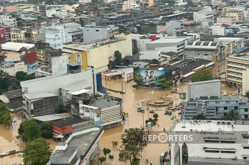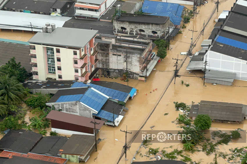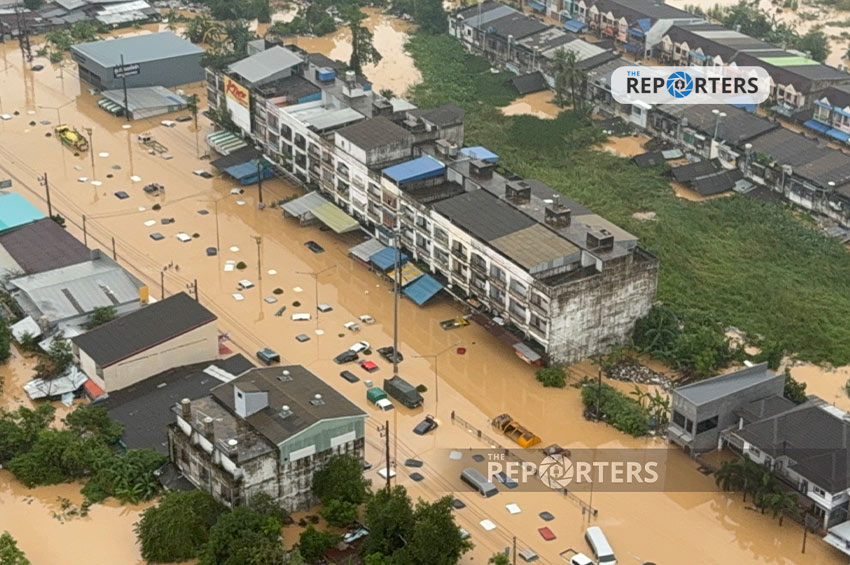 วันนี้ (26 พ.ย. 68) The Reporters ขึ้นบินติดตามภารกิจของกองทัพบกในการเคลื่อนย้ายผู้ป่วยจากโรงพยาบาลหาดใหญ่ อ. หาดใหญ่ จ. สงขลา ซึ่งน้ำท่วมวิกฤต ระดับน้ำหน้า รพ. ยังสูง 2-3 เมตร ส่วนด้านหลังโรงพยาบาลลดลงเล็กน้อยแต่ยังสูงกว่า 2 เมตร ในขณะที่ทั้งเมืองตั้งแต่แยกคอหงส์ ถนนเพชรเกษม ไปจนถึงหาดใหญ่ใน น้ำท่วมสูงตั้งแต่ 2-4 เมตร จมวงเวียนน้ำพุเขตเทศบาลนครหาดใหญ่ ต่อเนื่องถึงพื้นที่หาดใหญ่ใน เขต 3 เขต 4 และเขต 8 น้ำยังนิ่งทรงตัว ในภาพมิดบ้านชั้นเดียวและชั้นสอง รวมไปถึงด้านฝั่งสะพานดำ รพ.ศิครินทร์ ต่อเนื่องไปถึง ต. ควนลัง ต. คลองแห สถานการณ์ยังวิกฤต