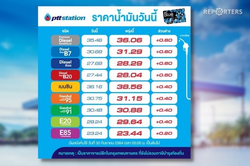 PTT Station ปรับราคาขายปลีกน้ำมันกลุ่มเบนซินและแก๊สโซฮอล์ทุกชนิดขึ้น 0.40 บาทต่อลิตร เว้น E85 ปรับขึ้น 0.20 บาทต่อลิตร ส่วนกลุ่มดีเซลทุกชนิด ปรับขึ้น 0.60 บาทต่อลิตร มีผล 30 ก.ย. นี้ ตั้งแต่ 05.00 น. เป็นต้นไป ส่งผลให้ราคาขายปลีก ไม่รวมภาษีบำรุงกรุงเทพมหานคร เป็นดังนี้