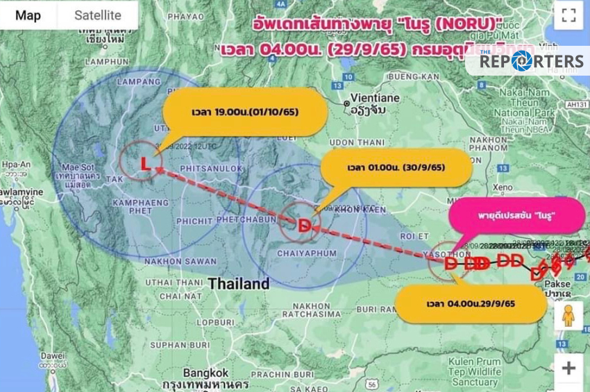 กรมอุตุนิยมวิทยา ออกประกาศ ฉบับที่ 19 ระบุว่า เมื่อเวลา 04.00 น.ของวันนี้ (29 ก.ย. 65) พายุดีเปรสชัน “โนรู” มีศูนย์กลางอยู่บริเวณอำเภอคำเขื่อนแก้ว จังหวัดยโสธร หรือที่ละติจูด 15.6 องศาเหนือ ลองจิจูด 104.2 องศาตะวันออก โดยมีความเร็วลมสูงสุดใกล้ศูนย์กลางประมาณ 55 กิโลเมตรต่อชั่วโมง