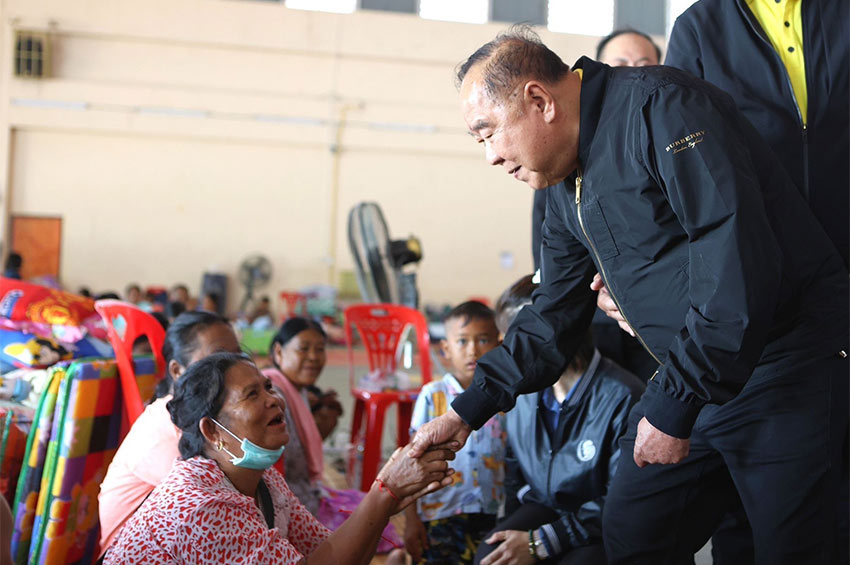 ก่อนเดินทางไปเยี่ยมชาวบ้านในศูนย์อพยพอีกสองแห่งในพื้นที่อีกสองแห่งในอำเภอเมือง จังหวัดสุรินทร์ เพื่อให้กำลังใจและมอบเครื่องอุปโภค บริโภคที่จำเป็นให้กับเจ้าหน้าที่ประจำศูนย์ เพื่อมอบให้กับชาวบ้านที่ยังคงต้องอาศัยอยู่ในศูนย์อพยพทั้งสองแห่ง จนกว่าสถานการณ์จะเข้าสู่ภาวะปกติ โดยให้กำลังใจชาวบ้าน พร้อมเชื่อว่า อีกไม่เกิน 2-3 วัน ก็เชื่อว่า ทุกคนจะได้กลับไปใชชีวิตตามปกติที่ภูมิลำเนาของทุกคน