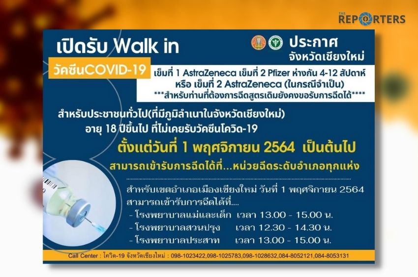 เชียงใหม่เปิด Walk in ฉีดวัคซีนสูตรไขว้ AstraZeneca – Pfizer สำหรับผู้ที่มีอายุ 18 ปีขึ้นไป และยังไม่เคยได้รับวัคซีนมาก่อน