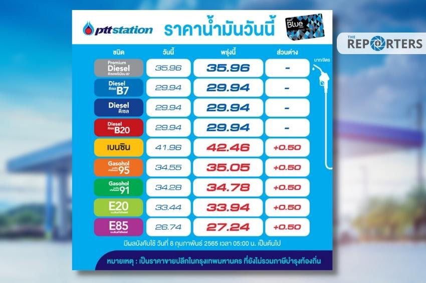 PTT Station ปรับราคาขายปลีกน้ำมันเบนซินและแก๊สโซฮอล์ทุกชนิดขึ้นลิตรละ 50 สตางค์ ส่วนกลุ่มดีเซลทุกชนิดราคาคงเดิม มีผล 8 ก.พ. 65 ตั้งแต่เวลา 05.00 น. เป็นต้นไป