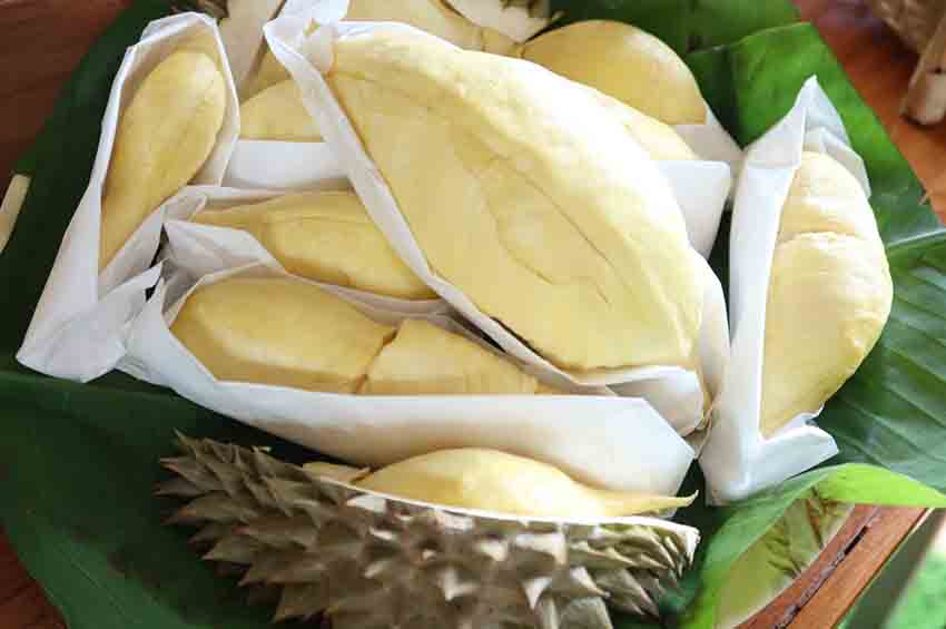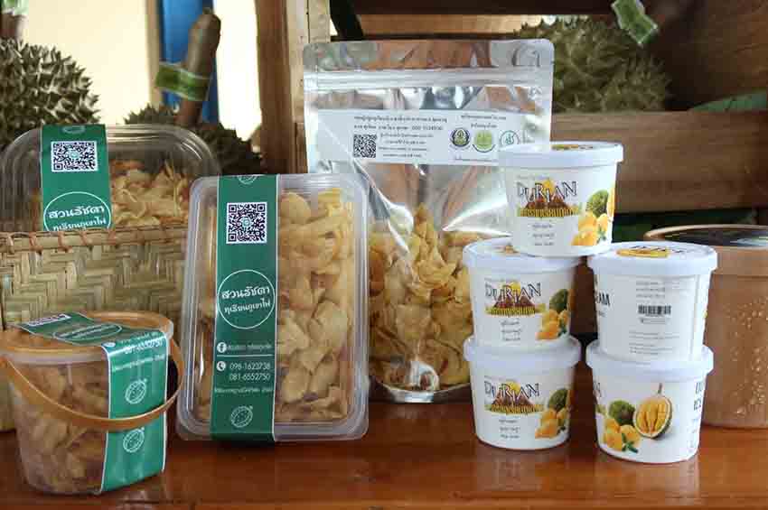 ด้าน นายชนินทร ท้าวธงชัย เจ้าของสวนบุญส่งทุเรียนภูเขาไฟศรีสะเกษ กลุ่มเครือข่ายวิสาหกิจชุมชนกลุ่มพัฒนาการผลิตทุเรียน ในพื้นที่อำเภอขุนหาญ กล่าวว่า ในช่วงที่ผ่านมา สวนบุญส่งได้รับคำแนะนำจากมหาวิทยาลัยราชภัฎศรีสะเกษ ได้ทำการศึกษาวิจัยการถนอมทุเรียนและแปรรูปทุเรียนสู่การเพิ่มมูลค่า ในช่วงที่ผ่านมามีผลผลิตออกมาค่อนข้างมาก สวนบุญส่งจึงได้พัฒนาแปรรูปเป็นทุเรียนไอศกรีม ทุเรียนกวนและทุเรียนแช่แข็ง ทำให้สามารถมีผลิตภัณฑ์แปรรูปจากทุเรียนขายได้ตลอดปีและลูกค้าสั่งสินค้ามาอย่างต่อเนื่องเช่นกัน ทำให้ผู้บริโภคเข้าใจถึงอัตลักษณ์เฉพาะทุเรียนภูเขาไฟศรีสะเกษ “กรอบนอก นุ่มใน หวานมัน ละมุนลิ้น กลิ่นไม่ฉุน”