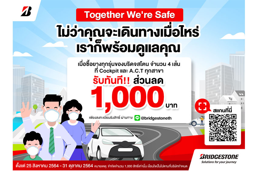 “ครั้งนี้ในนามของ บริดจสโตนเซลส์ ประเทศไทย ตั้งใจที่จะสานต่อความช่วยเหลือเพื่อบุคลากรด่านหน้าในสถานการณ์โควิด-19 ในปัจจุบัน ด้วยการร่วมกับศูนย์บริการค็อกพิท และ เอ.ซี.ที. ทั่วประเทศ จัดแคมเปญพิเศษ “Together We’re Safe” สำหรับบุคลากรทางการแพทย์ทุกตำแหน่ง รวมถึงรถพยาบาล รถกู้ชีพ-กู้ภัย และรถฉุกเฉิน ร่วมสู้ภัยโควิด ด้วยการจัดโปรโมชั่นซื้อยาง บริดจสโตน 3 เส้น ทุกรุ่น ทุกขนาด แถมฟรี 1 เส้น* (ยางที่แถมต้องเป็นรุ่นและขนาดเดียวกัน) ระหว่างวันที่ 25 สิงหาคม – 31 ตุลาคม นี้ และสำหรับลูกค้าทั่วไปจะมีข้อเสนอพิเศษเมื่อลงทะเบียนรับสิทธิ์ส่วนลดผ่านทาง LINE @bridgestoneth จะได้รับ SMS ส่วนลด 1,000 บาท ทันทีสำหรับการเปลี่ยนยางบริดจสโตน 4 เส้น โดยลูกค้าทุกท่านสามารถลงทะเบียนไว้ก่อนตั้งแต่วันนี้ – 31 ตุลาคม และสามารถใช้สิทธิ์เปลี่ยนยางในช่วงเวลาที่สะดวกถึงวันที่ 30 พฤศจิกายน 2564 ที่ศูนย์บริการค็อกพิท และเอ.ซี.ที ทั่วประเทศ โดยแคมเปญพิเศษนี้เป็นไปตามแนวทางที่บริดจสโตนวางไว้ คือ ขอร่วมเดินทางเคียงข้างคนไทยอย่างปลอดภัยร่วมฝ่าวิกฤตโควิด-19 ไปด้วยกัน”