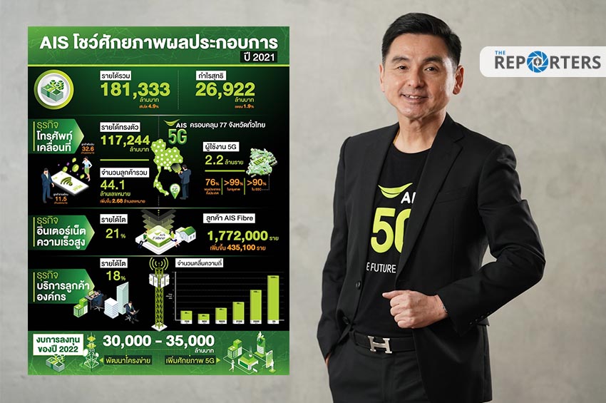 AIS โชว์ผลประกอบการปี 2564 รายได้รวมอยู่ที่ 181,333 ล้านบาท แสดงถึงความเติบโตร้อยละ 4.9 กำไรสุทธิ 26,922 ล้านบาท ด้วยความทุ่มเทของบุคลากรกว่า 12,000 คน ในการยกระดับคุณภาพการให้บริการ คุณภาพของโครงข่ายสัญญาณ เพื่อสร้างประสบการณ์ดิจิทัลไลฟ์สไตล์ที่ตอบโจทย์ให้กับคนไทย รวมถึงการนำศักยภาพของ 5G ด้วยการวางโครงสร้างพื้นฐานด้านดิจิทัลที่แข็งแรงเข้าสนับสนุนการเติบโตของภาคส่วนต่างๆ