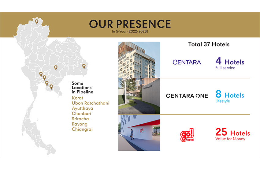 นายภูมิ จิราธิวัฒน์ Head of Hotel Property บมจ.เซ็นทรัลพัฒนา กล่าวว่า “เรามุ่งมั่นที่จะส่งเสริมศักยภาพของเมืองและจังหวัดต่างๆ สร้าง Big Impact ในระดับประเทศ ดังเช่นธุรกิจอื่นๆ ของเซ็นทรัลพัฒนา ด้วยจุดแข็งของธุรกิจโรงแรมที่มีทำเลดี, มีแบรนด์ที่ตอบโจทย์ทุกเซ็กเมนต์ และความร่วมมือกันในธุรกิจของเซ็นทรัลพัฒนาเองและในกลุ่มเซ็นทรัล ทำให้การมาพักอาศัยที่โรงแรมของเราเป็น Seamless Journey ที่แตกต่างจากโครงการอื่นที่มีอยู่ในตลาด โดยเราพร้อมตอบโจทย์นักเดินทางครอบคลุมทุกเซ็กเมนต์ด้วย 3 แบรนด์ ได้แก่ ‘Centara’ แบรนด์ระดับ Upscale, ‘Centara One’ แบรนด์ระดับ Lifestyle Midscale โดยทั้งสองแบรนด์นี้ยังเป็นครั้งแรกที่เราได้นำคอนเซ็ปต์ ‘Bleisure’ คือ Business + Leisure เพื่อตอบโจทย์ทั้งการพักผ่อนและการทำงานอีกด้วย ส่วนอีกแบรนด์หนึ่งคือ ‘Go! Hotel’ แบรนด์ระดับ Premium Budget โดยวางแผนปักหมุดโลเคชั่น อาทิ โคราช, อุบลราชธานี, อยุธยา, ระยอง, ศรีราชา, ชลบุรี และเชียงราย เป็นต้น”
