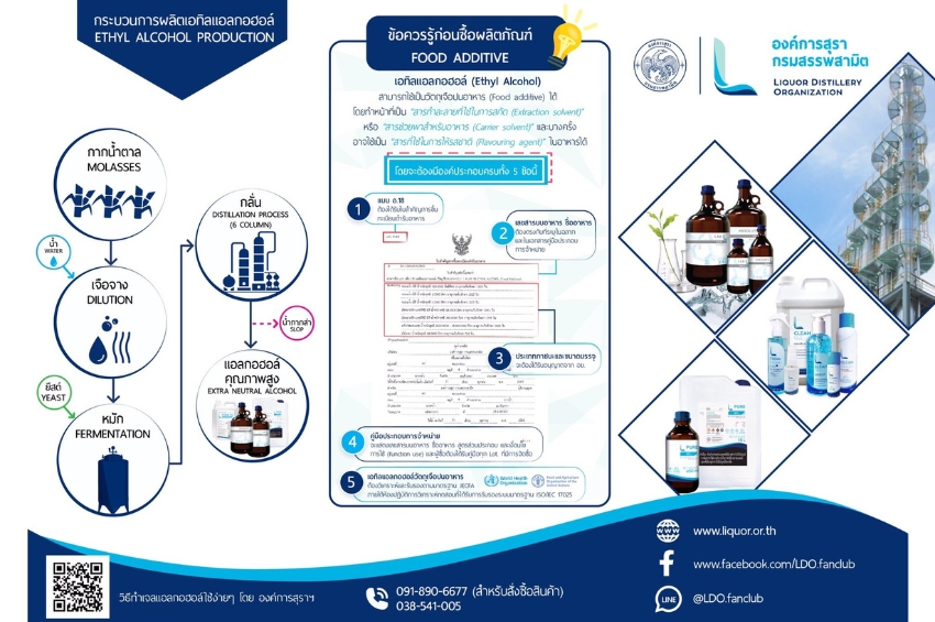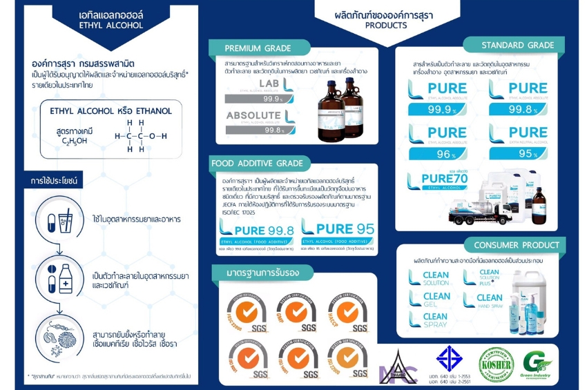 ทั้งนี้ สินค้าเอทิลแอลกฮออล์ขององค์การสุรา ที่นำไปใช้ในอุตสาหกรรมยาและเวชภัณฑ์ เครื่องสำอาง อาหารและเครื่องปรุงรส เครื่องดื่ม และอื่น ๆ มีด้วยกัน 2 ชนิด คือ L PURE 95 และ L PURE 99.8 ซึ่งได้รับใบอนุญาตผลิตอาหาร และใบสำคัญการขึ้นทะเบียนตำรับอาหาร จากสำนักงานคณะกรรมการอาหารและยา (อย.) ผลิตตามระบบมาตรฐานการรับรองความปลอดภัยสำหรับการผลิตอาหาร FSSC 22000 V.5.1 ได้รับการยอมรับโดยโครงการความปลอดภัยทางอาหารระดับโลก (GFSI) และผ่านการควบคุมคุณภาพสินค้าด้วยห้องปฏิบัติการที่ได้รับการรับรองมาตรฐานสากล ISO/IEC 17025:2017