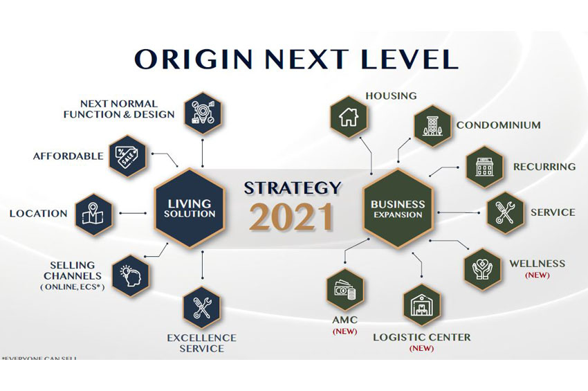 สำหรับแนวคิด ORIGIN NEXT LEVEL ประกอบด้วย 2 แกนหลัก ได้แก่ 1.Next Level of Business Expansion ขยายธุรกิจทั้งเชิงกว้างและเชิงลึกด้วยทำเลใหม่ (New Location) แบรนด์ใหม่ (New Brand) กลุ่มธุรกิจใหม่ (New Business) ความร่วมมือใหม่ (New Collaboration) เพื่อตอบโจทย์กลุ่มเป้าหมายใหม่ (New Target Segmentation) โดยกลุ่มโครงการที่อยู่อาศัยจะมีการเปิดตัวใหม่ในปีนี้ 20 โครงการ มูลค่าโครงการรวม 20,000 ล้านบาท 2.Next Level of Living Solutions สร้างสรรค์ทั้งฟังก์ชั่นใหม่