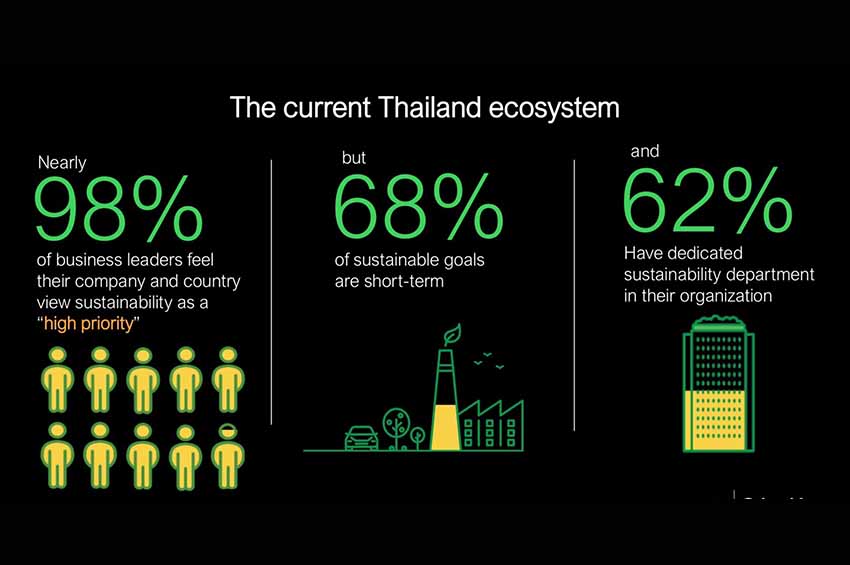 จากการสำรวจกลุ่มองค์กรในประเทศไทย พบว่าเกือบทุกบริษัท (มากกว่า 90%) ตระหนักดีว่าการเปลี่ยนผ่านสู่ดิจิทัลเป็นตัวขับเคลื่อนที่สำคัญของความยั่งยืน รวมถึงหลายองค์กรให้ความสำคัญกับประสิทธิภาพการใช้พลังงานเป็นองค์ประกอบพื้นฐานของแผนความยั่งยืน