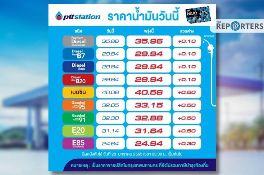 PTT Station ปรับราคาขายปลีกน้ำมันเบนซินและแก๊สโซฮอล์ทุกชนิดขึ้นลิตรละ 50 สตางค์ ยกเว้น E85 ปรับขึ้นลิตรละ 30 สตางค์ ส่วนกลุ่มดีเซลทุกชนิด ปรับขึ้นลิตรละ 10 สตางค์ มีผล 20 ม.ค. 65 ตั้งแต่เวลา 05.00 น. เป็นต้นไป
