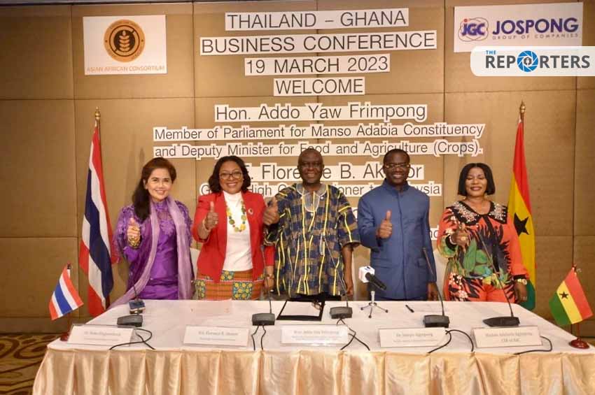 ดร.สิชา สิงห์สมบุญ กงสุลกิตติมศักดิ์สาธารณรัฐกานาประจำประเทศไทย พร้อมด้วย นาย เยา ฟริมพง อัดโด ( H.E. Mr. Addo Yaw Frimpong ) รัฐมนตรีช่วยว่าการกระทรวงอาหารและเกษตรแห่งสาธารณรัฐกานา นางฟลอเรนซ์ บัวร์คิอโคนอร์ (H.E. Mrs. Florence Buerki Akonor ) เอกอัครราชทูตสาธารณรัฐกานาประจำประเทศมาเลเซีย ดร.โจเซฟ เซียว อาชพง ประธานบริษัท โจสพง กรุ๊ป ออฟ คอมปานีส์ สาธารณรัฐกานา นางแอเดอเลด อราบา เซียว อาชพง (delaide Araba Siaw Agyepon : CEO of AAC ) ประธานบริหารบริษัทเอเชียนแอฟริกันคอนซอเตียม ร่วมกันแถลงข่าวความร่วมมือการค้า การลงทุนระหว่างไทยและกานา ที่โรงแรมแกรนด์ ฟอร์จูน โฮเทล กรุงเทพฯ