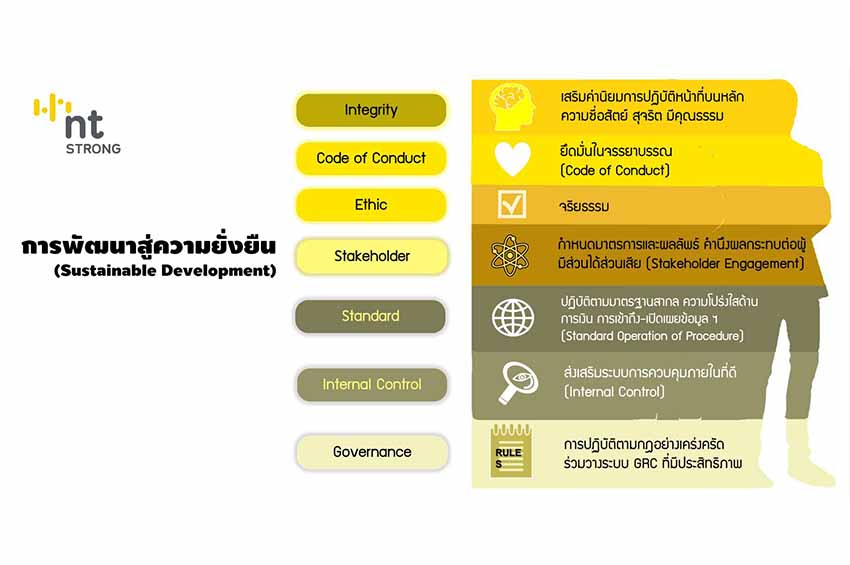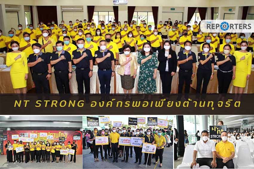 บริษัท โทรคมนาคมแห่งชาติ จำกัด (มหาชน) หรือ NT ยึดมั่นในการดำเนินงานภายใต้ความรับผิดชอบต่อสังคม และผู้มีส่วนได้เสีย และยึดถือปฏิบัติหน้าที่อย่างเคร่งครัดตามหลักธรรมาภิบาล (Good Governance) ไม่ว่าจะเป็นผู้บริหาร และพนักงาน โดย NT Strong ถือเป็นอีกหนึ่งกิจกรรมที่ทุกคนในองค์กรสามารถเข้าร่วมแสดงพลังประกาศจุดยืนร่วมต่อต้านการทุจริตในทุกรูปแบบ เนื่องในวันต่อต้านคอร์รัปชันแห่งชาติ ประจำปี 2565 ภายใต้แนวคิด “ผู้นำ…กับการปราบโกง” ซึ่งจัดขึ้นต่อเนื่องทุกปี เพื่อกระตุ้นให้ทุกภาคส่วนของสังคมเกิดความตื่นตัวและไม่ยอมรับการโกงทุกรูปแบบ และผู้นำมีบทบาทสำคัญในการปราบคอร์รัปชันทุกรูปแบบ ต้องกล้าตัดสินใจ กล้าทำให้เห็นและเป็นแบบอย่างที่ดี รณรงค์ให้ทุกคนตระหนักถึงคอร์รัปชันคือสิ่งบั่นทอนการพัฒนาประเทศ และสร้างแรงบันดาลใจให้กับพนักงานทุกคนในองค์กรร่วมกันต่อต้านการทุจริต พร้อมในการปลูกฝังและส่งเสริมบุคลากรในองค์กรก้าวเติบโตอย่างมีคุณภาพ มีคุณธรรม มีจริยธรรม และจรรยาบรรณ”