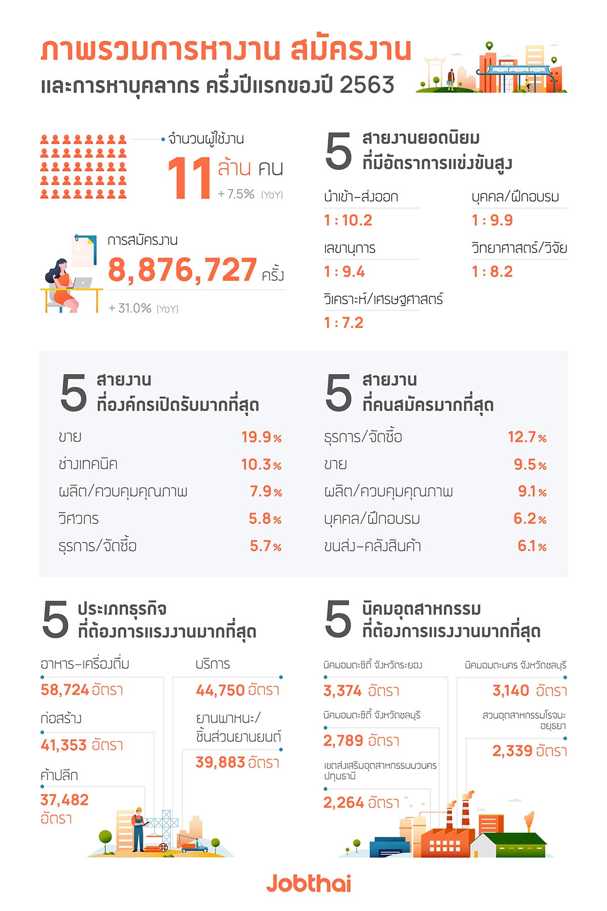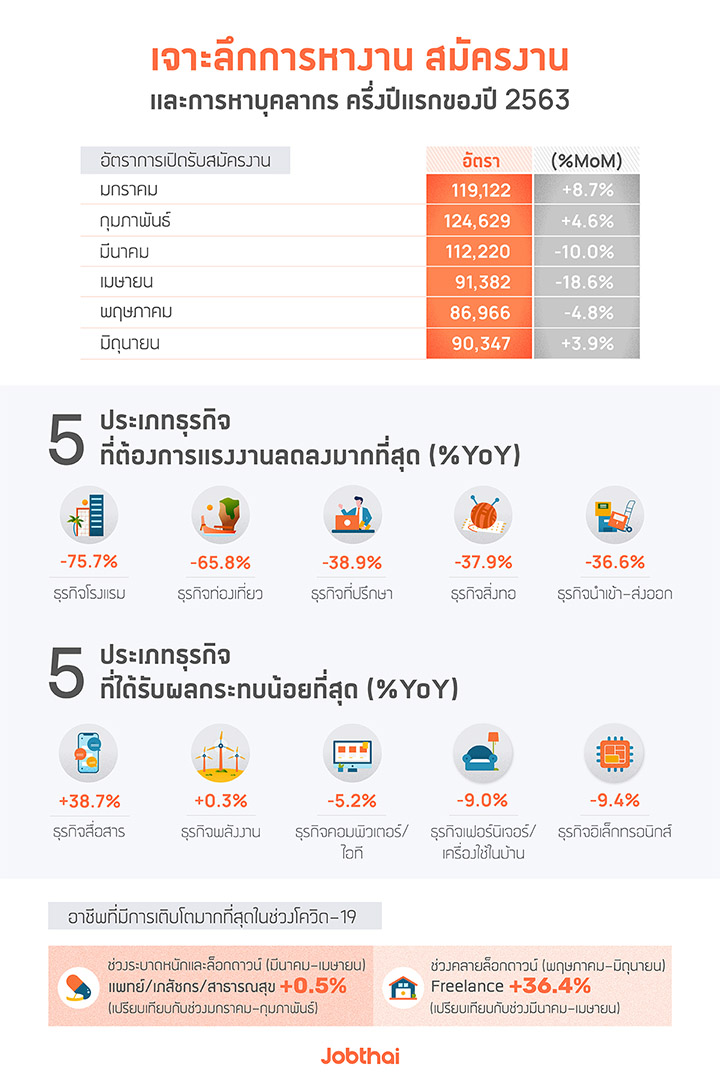 นางสาวแสงเดือน กล่าวต่อว่า ในช่วงครึ่งปีที่ผ่านมาสถานการณ์ด้านตลาดแรงงานมีความผันผวนจากการระบาดของไวรัสโควิด-19 องค์กรต้องปรับเปลี่ยนรูปแบบการทำงานให้ทันต่อสถานการณ์อยู่เสมอ คนทำงานเองต้องพร้อมที่จะปรับเปลี่ยนการทำงานของตัวเองอยู่ตลอดเวลา การพัฒนาทักษะอยู่ตลอดเวลาเป็นเรื่องที่สำคัญมากในการทำงานยุคนี้ สำหรับทิศทางของตลาดแรงงานจากนี้ไปคาดว่าจะฟื้นตัวอย่างค่อยเป็นค่อยไป เมื่อเราดูสถิติช่วงต้นเดือนกรกฎาคม พบว่า สายอาชีพที่มีแน้วโน้มเปิดรับเพิ่มขึ้น ได้แก่ Freelance, อาจารย์/ครู, แพทย์/เภสัชกร/สาธารณสุข สำหรับการหางาน สมัครงานในจ๊อบไทยมีการเติบโตขึ้นมาก ซึ่งจ๊อบไทยได้ออกฟีเจอร์การค้นหางานที่ให้ทำงานที่บ้านได้ (Work from Home) และค้นหางานที่เปิดรับสัมภาษณ์ออนไลน์ เพื่อสร้างความสะดวก ตอบโจทย์ความต้องการของผู้ประกอบการและคนหางานด้วย