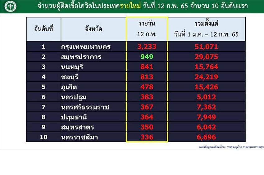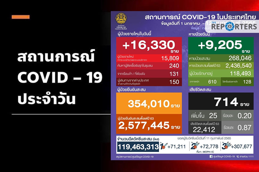 ศูนย์บริหารสถานการณ์การแพร่ระบาดของโรคติดเชื้อไวรัสโคโรนา 2019 รายงานสถานการณ์โควิด-19 ในประเทศไทยวันนี้ (12 ก.พ. 65) พบผู้ติดเชื้อใหม่ 16,330 รายแบ่งเป็นผู้ป่วยจากระบบเฝ้าระวังและระบบบริการ 15,809 ราย จากการค้นหาผู้ติดเชื้อเชิงรุกในชุมชน 240 ราย จากเรือนจำ/ที่ต้องขัง 131 ราย และผู้ที่เดินทางมาจากต่างประเทศ 150 ราย