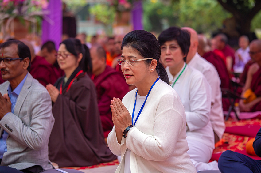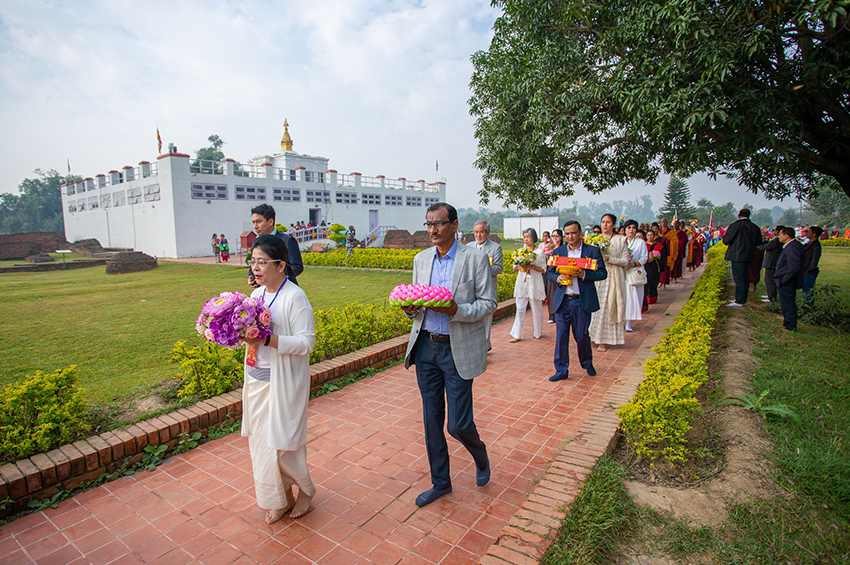 สำหรับพิธีเริ่มขึ้นตั้งแต่ในช่วงเช้า คณะสงฆ์ และพุทธศาสนิกชน จัดขบวนแห่สาธยายพระไตรปิฎกนานาชาติ เริ่มที่บริเวณ ลานพระโพธิสัตว์สิทธัตถะราชกุมาร หรือ พระพุทธเจ้าน้อย ไปจนถึง บริเวณโดยรอบ เวชนียสถาน ขบวนของคณะสงฆ์ ได้วนรอบ มายาเทวีวิหารและสระโบกขรณี จากนั้นจึงเข้าสู่พิธีการสวดสาธยายพระไตรปิฎก ของแต่ละประเทศ