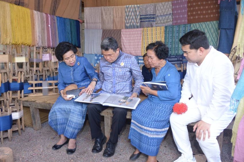 โดยจุดแรกที่เสด็จคือที่บ้านแม่ถวิล อุปรีย์ ทรงไปประทับนั่งเข็นฝ้ายคู่กับยายเจียงจันทร์ แล้วเสด็จไปใต้ถุนบ้านซึ่งมีพี่น้องสมาชิกกลุ่มกำลังช่วยกันทอผ้า ย้อมผ้าอยู่ ด้วยสีพระพักตร์ที่แช่มชื่น พร้อมทรงอุปกรณ์ต่าง ๆ ที่ชาวบ้านทูลเกล้าฯ ถวาย ทั้งสวมเอี๊ยม สวมถุงมือ แล้วมัดย้อม และย้อมคราม แล้วทรงไปที่กี่ทอผ้า เพื่อพระราชทานขวัญกำลังใจให้ทุกคนด้วยการทรงลงมือทอผ้าด้วยพระองค์เอง ทำให้พวกเราทุกคนได้ชื่นชมพระอัจฉริยภาพของพระองค์ท่านในด้านงานหัตถกรรมไทย