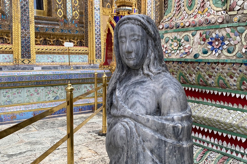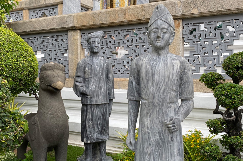 หากย้อนกลับไปดูบทความเรื่อง “พบรูปปั้นเต็มตัวพระเจ้านโปเลียนที่ 3 ที่ลานวัดพระแก้ว” ของ ไกรฤกษ์ นานา ที่เผยแพร่ในเว็บไซต์ศิลปวัฒนธรรม เมื่อวันที่ 31 สิงหาคม พ.ศ.64 จะพบข้อมูลในจดหมายเหตุการบูรณะปฏิสังขรณ์วัดพระศรีรัตนศาสดาราม สมัยรัชกาลที่ 5 ว่ามีการสั่งเครื่องตั้งประดับพระอารามที่เป็นศิลาเข้ามาใหม่ เป็นรูปปั้นหินอ่อนจากตะวันตก สอดคล้องกับภาพถ่ายของ William Kennett Loftus ช่างภาพหลวงที่บันทึกภาพรูปปั้นชายฝรั่ง คล้ายพระเจ้านโปเลียนที่ 3 แห่งฝรั่งเศส ที่ลานวัดพระแก้วไว้ราว พ.ศ.2425 ซึ่งเป็นปีเดียวกันกับงานสมโภชกรุงรัตนโกสินทร์ 100 ปี