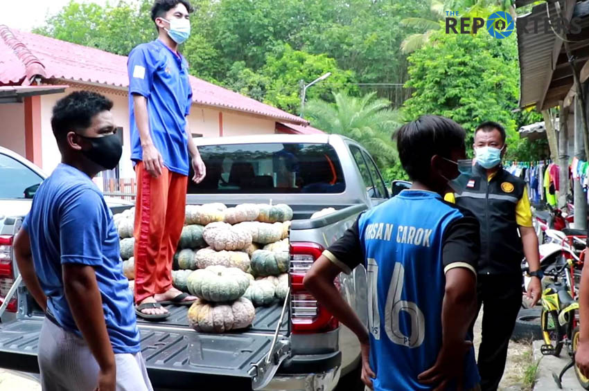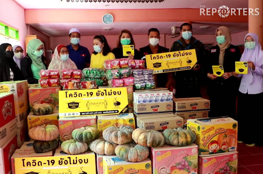 นางกนกรัตน์ เกื้อกิจ ผู้ช่วยเลขาธิการ ศอ.บต. พร้อมคณะ มอบเครื่องบริโภค เครื่องดื่ม นมกล่อง ขนมขบเคี้ยวและฟักทอง แก่นางแยนะ สะแลแม เครือข่ายผู้หญิงภาคสังคม เพื่อนำไปแจกจ่ายช่วยเหลือ ประชาชนในพื้นที่ตำบลเกาะสะท้อน อำเภอตากใบ จังหวัดนราธิวาส ที่ได้รับผลกระทบจากสถานการณ์การแพร่ระบาดของโรคโควิด-19 และปิด 9 หมู่บ้าน