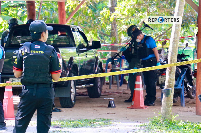 จากการตรวจสอบจุดเกิดเหตุ เบื้องต้นไม่พบปลอกกระสุนที่คนร้ายใช้ ส่วนผู้เสียชีวิตถูกยิงด้วยอาวุธปืนอย่างน้อย 2 กระบอก ทั้งอาวุธปืนลูกซอง และอาวุธอีกชนิด เนื่องจากพบร่องรอยของกระสุนปืนตามร่างกายจำนวนหลายจุด