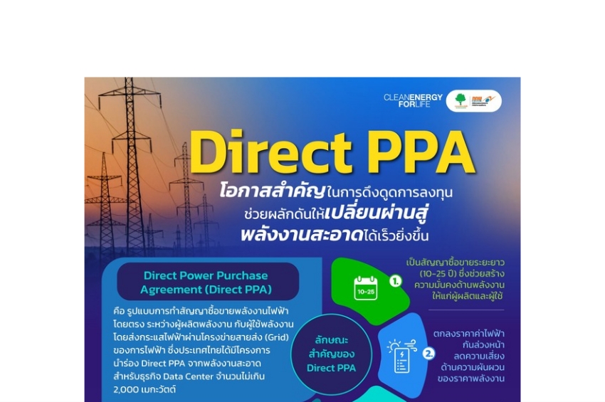 ทำความรู้จักกับ Direct PPA (Direct Power Purchase Agreement) รูปแบบการทำสัญญาซื้อขายพลังงานไฟฟ้าโดยตรง ระหว่างผู้ผลิตพลังงาน กับผู้ใช้พลังงาน โดยส่งกระแสไฟฟ้าผ่านโครงข่ายสายส่ง (Grid) ของการไฟฟ้า ที่จะเป็นโอกาสสำคัญในการดึงดูดการลงทุน ช่วยผลักดันให้เปลี่ยนผ่านสู่พลังงานสะอาดได้เร็วยิ่งขึ้น