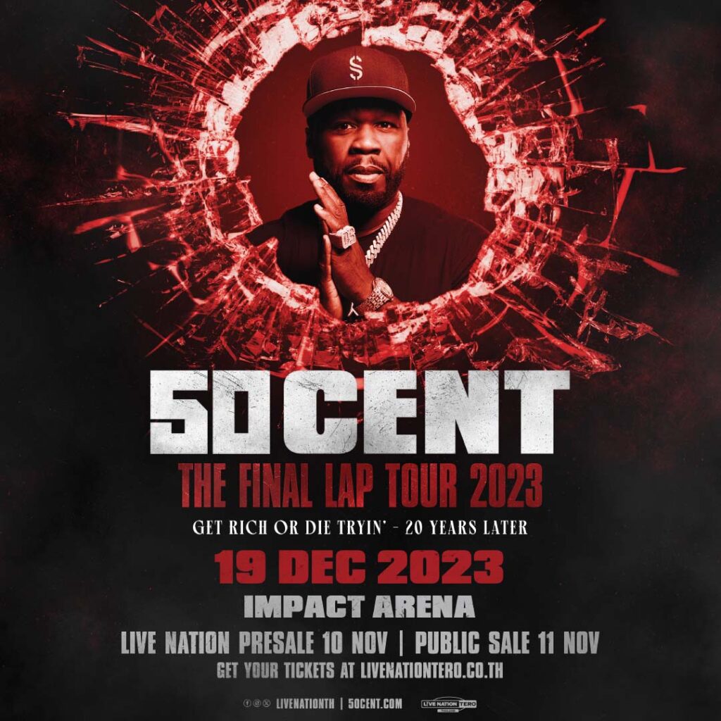 แฟนชาวไทยเตรียมตัวพบกับเจ้าพ่อเพลงฮิปฮอป หนึ่งในต้นตำรับ Gangsta Rapper รำลึกความหลังเมื่อครั้งใส่สแนปแบ็คสีสดใสในยุค Bling Era เอ็นจอยกับเพลงฮิตที่ทุกคนคุ้นหูทั้ง “In Da Club” (อิน ดา คลับ), “21 Questions” (ทเวนตี้ วันเควสชั่นส์), “Get Up” (เก็ท อัป) และ “Hate It Or Love It” (เฮท อิท ออร์ เลิฟ อิท) ในคอนเสิร์ต “50 Cent The Final Lap Tour