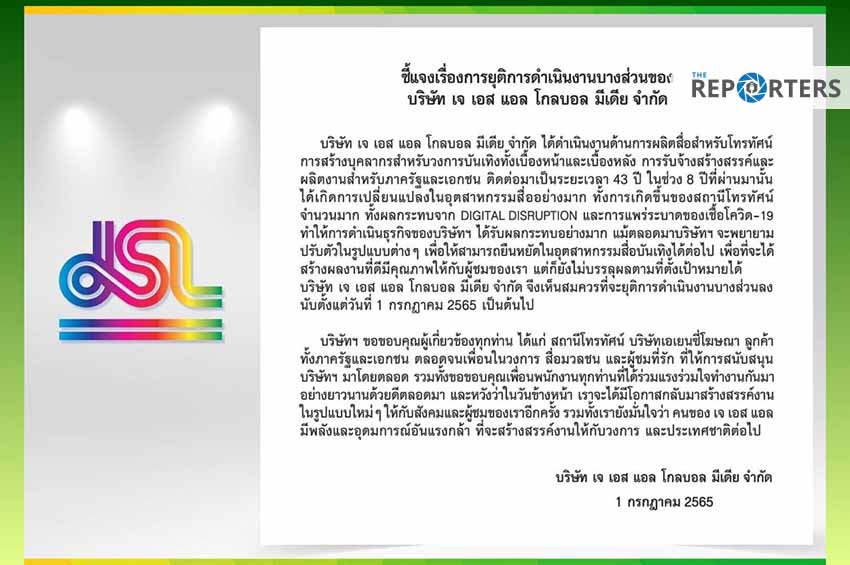 บริษัท เจ เอส แอล โกลบอล มีเดีย จำกัด จึงเห็นสมควรที่จะยุติการดำเนินงานบางส่วนลง นับตั้งแต่วันที่ 1 กรกฎาคม 2565 เป็นต้นไป บริษัทฯ ขอขอบคุณผู้เกี่ยวข้องทุกท่าน ได้แก่ สถานีโทรทัศน์ บริษัทเอเยนซี่โฆษณา ลูกค้าทั้งภาครัฐและเอกชน ตลอดจนเพื่อนในวงการ สื่อมวลชน และผู้ชมที่รัก ที่ให้การสนับสนุนบริษัทฯ มาโดยตลอด