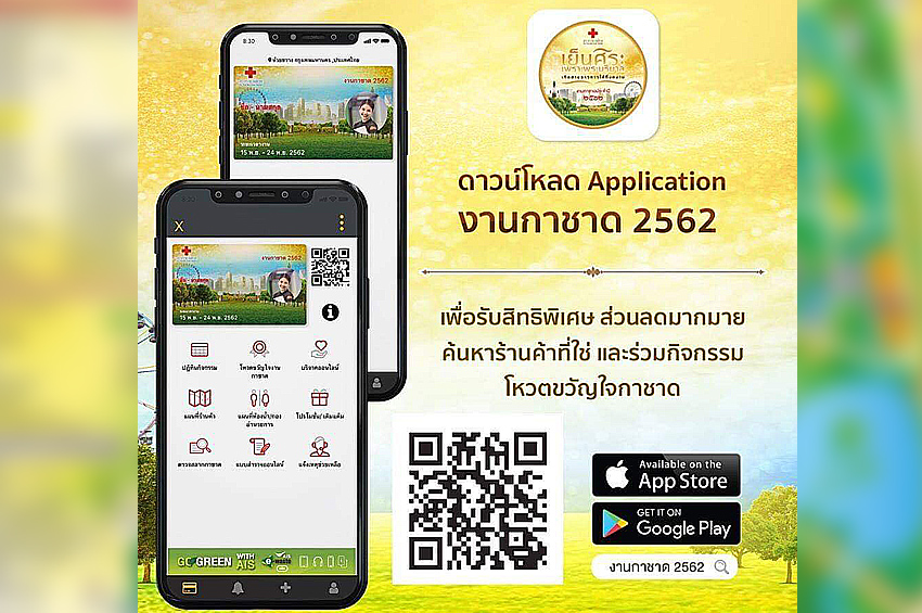 ผู้สนใจสามารถดาวน์โหลดแอปพลิเคชัน “งานกาชาด 2562” เพื่อติดตามข่าวสาร ปฏิทินกิจกรรม แผนที่ร้านค้า โปรโมชั่นต่าง ๆ และยังสามารถตรวจสลากกาชาดภายหลังจบงานได้อีกด้วย นับเป็นการลดการใช้กระดาษ แผนที่ และแผ่นพับ เพื่อทำให้งานกาชาดเป็นโมเดลต้นแบบของงานมหกรรมรื่นเริงการกุศลที่เป็นมิตรกับสิ่งแวดล้อม และช่วยลดปริมาณขยะ